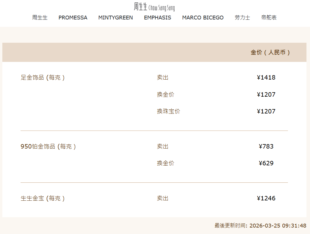 受此影响,国里面分品牌金饰价钱也随之上调,克价重回1400元。中新经纬25日查询到,周生生足金饰品报1418元/克,单日高潮68元;老凤祥报价1408/克,单日高潮63元/克。