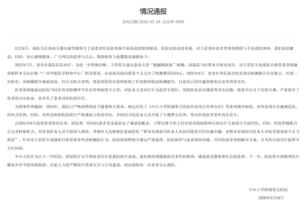 据中山五院通报,2023年7月,患者在该院入院治愈。为进一步明确会诊,支配医师提议患者完善“脱髓鞘抗体”检测。因该院那时暂未开展该方式,该支配医师违法背地推选患者将脑脊液样本交由自称“广州华银医学训诫中心”职员梁某,由家属径直向梁某个东说念主支付了检测用度5318元。2025年8月,患者在外院复诊时发现该检测论述存在疑窦,经进一步核实,该检测论述确系伪造。经公安机关查明,梁某欺诈其在训诫机构职责的便利伪造检测论述,当今其已因犯欺诈罪被照章讲究处分。