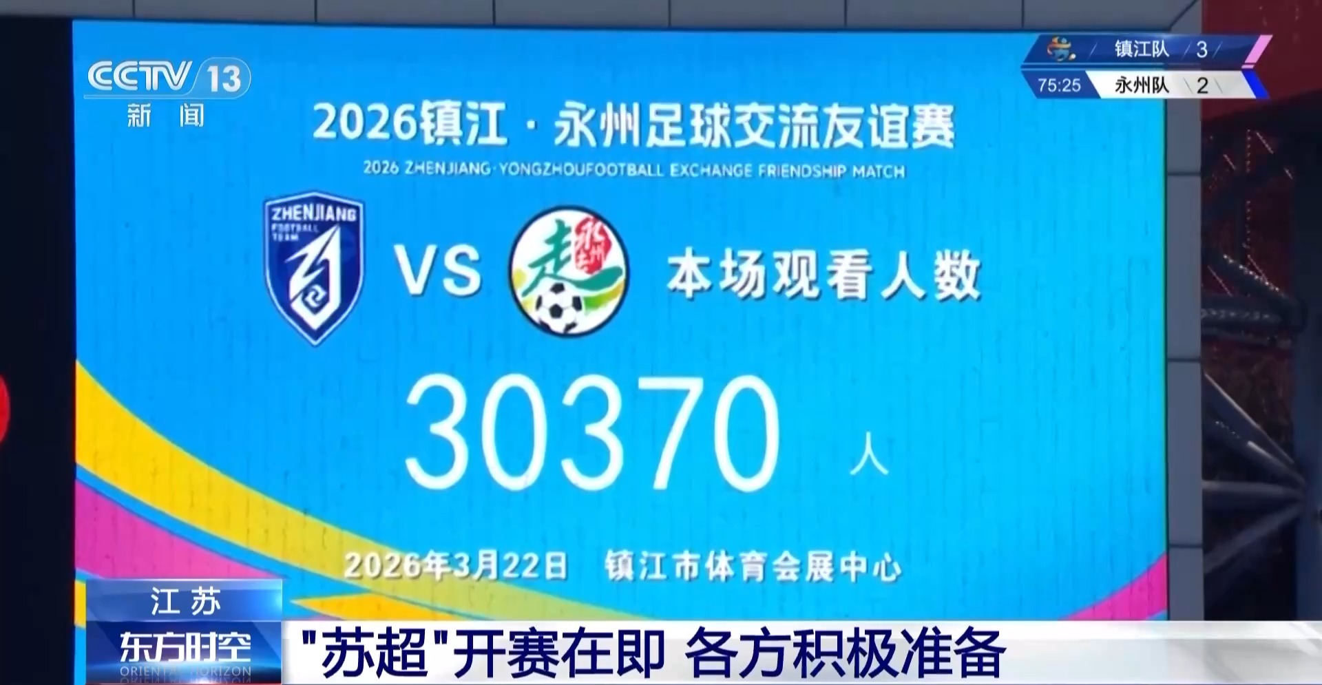 3月22日,镇江·永州足球疏通友谊赛在镇江举行。队员们以球会友、以赛促练,3万多名球迷现场大叫,为球队的每一次比拼加油。