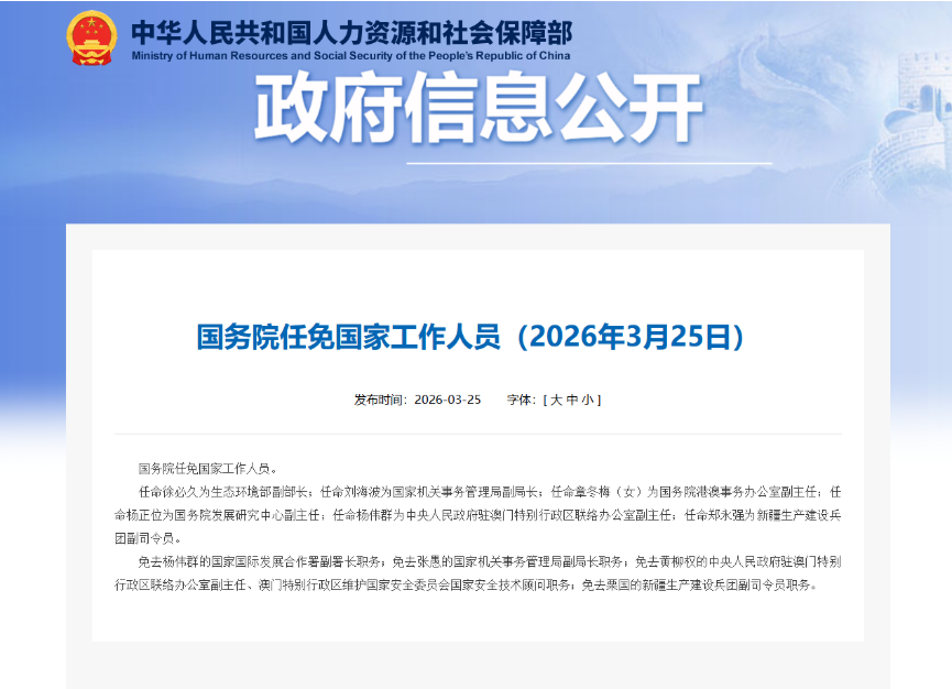 国务院任免国度责任主说念主员(2026年3月25日)